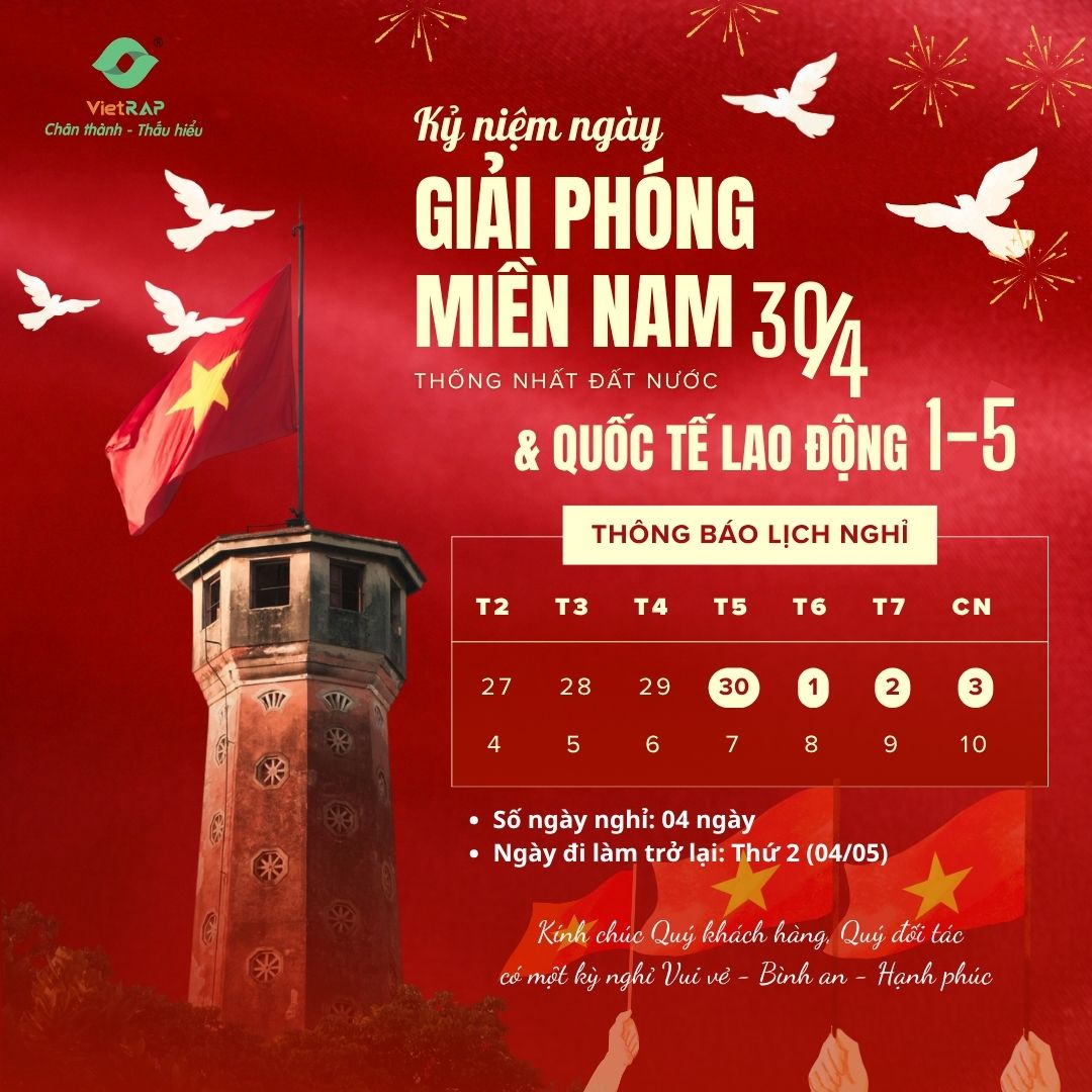 Chúng tôi trân trọng thông báo lịch nghỉ lễ nhân dịp 30/4 và 1/5 như sau: