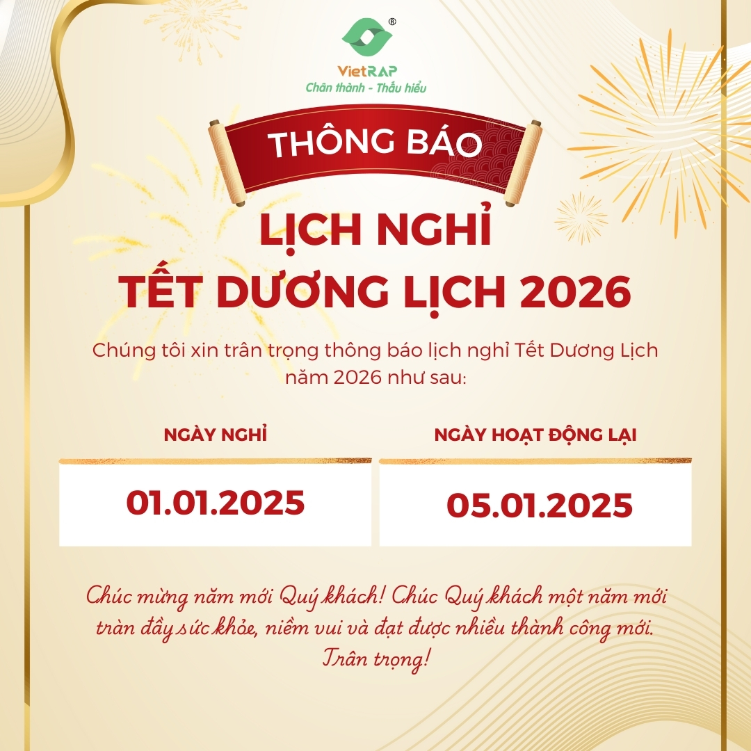 Nhằm tạo điều kiện để mọi người có thời gian nghỉ ngơi, sum họp cùng gia đình nhân dịp Tết Dương lịch 2026, VietRAP xin trân trọng thông báo lịch nghỉ như sau:
