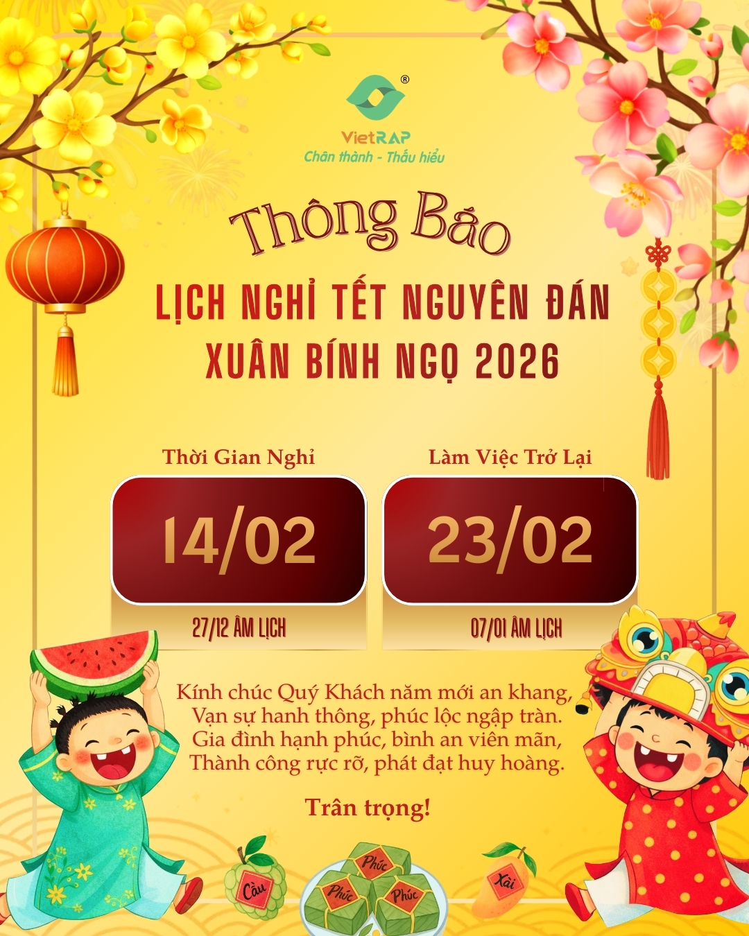 Nhân dịp Xuân Bính Ngọ 2026 đang đến gần, Công ty xin trân trọng thông báo lịch nghỉ Tết như sau: